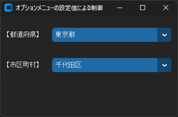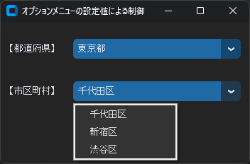 - 都道府県メニュー の選択内容で 市区町村メニュー の選択肢が変わるサンプル